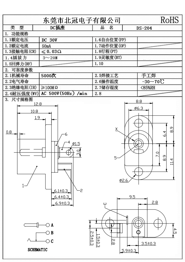 Typical Specifications 1. Rating : DC 30V 0.5A 2. Contact Resistance : 70ΩMax 3.Lnsulation Resistance: DC500V 1Minute 4.Operating Temperature Range: -25℃+80℃ 5.Ambient Humidity Used: ≤85%RH 6. Operating Force : 3-20N 7. Operating Life : 5,000Cycles