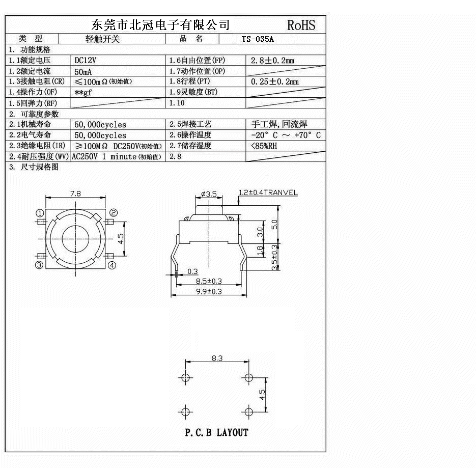3.Lnsulation Resistance: ≥100mΩ DC250V