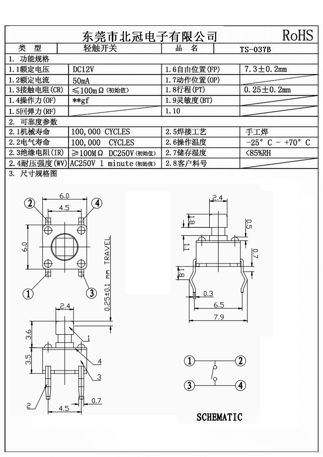 Typical Specifications 1.Rating : DC 12V 50mA 2.Contact Resistance: ≤100mΩ 3.Lnsulation Resistance: ≥100mΩ DC250V 4.Operating Temperature Range: -25℃+80℃ 5.Ambient Humidity Used: ≤85%RH 6.Operating Force : 180gf,250gf 7.Travel:0.25±0.1mm 8.Life : 100,000 Cycles
