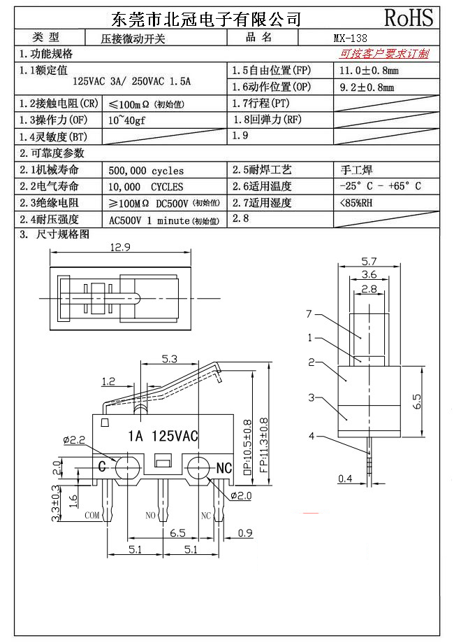 Typical Specifications 1.Rating : DC30V 0.1A 2.Contact Resistance: ≤100mΩ 3.Lnsulation Resistance: ≥100mΩ DC500V 4.Operating Temperature Range: -25℃+85℃ 5.Ambient Humidity Used: ≤85%RH 6.Mechanical Life: 100,000Cycles 7.Operating Force:30±10gf 8.OP:8.8±0.8mm 9.Order: AC 125V 3A