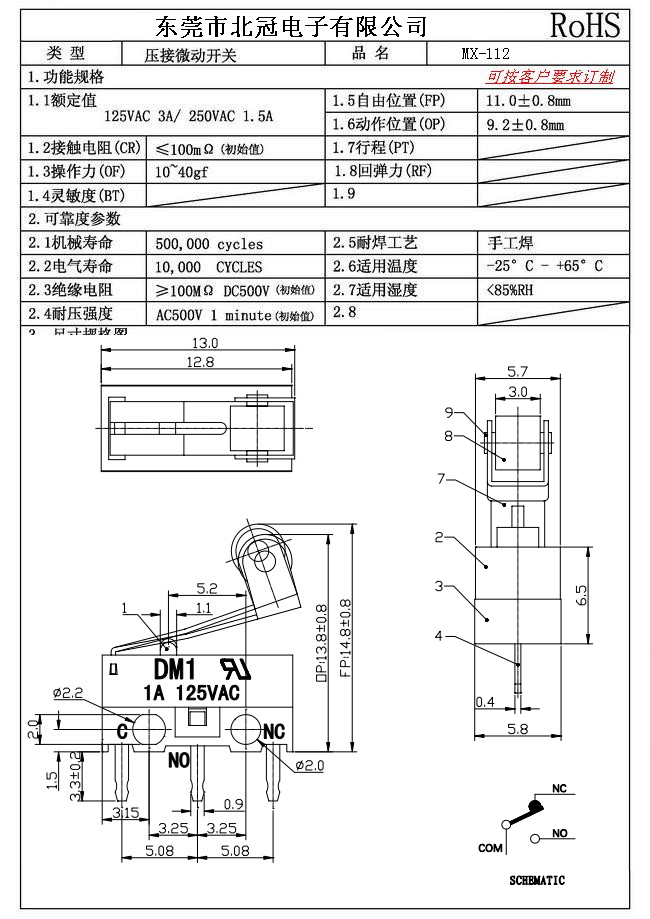 Typical Specifications 1.Rating : DC30V 0.1A 2.Contact Resistance: ≤100mΩ 3.Lnsulation Resistance: ≥100mΩ DC500V 4.Operating Temperature Range: -25℃+85℃ 5.Ambient Humidity Used: ≤85%RH 6.Mechanical Life: 100,000Cycles 7.Operating Force:30±10gf 8.OP:8.8±0.8mm 9.Order: AC 125V 3A