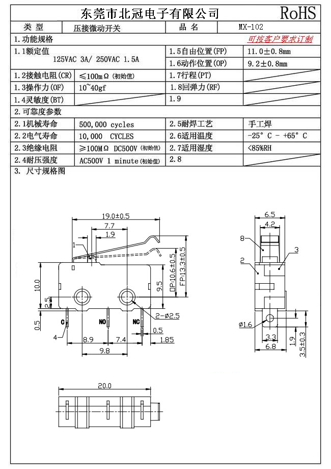Typical Specifications 1.Rating : DC30V 0.1A 2.Contact Resistance: ≤100mΩ 3.Lnsulation Resistance: ≥100mΩ DC500V 4.Operating Temperature Range: -25℃+85℃ 5.Ambient Humidity Used: ≤85%RH 6.Mechanical Life: 100,000Cycles 7.Operating Force:30±10gf 8.OP:8.8±0.8mm 9.Order: AC 125V 3A