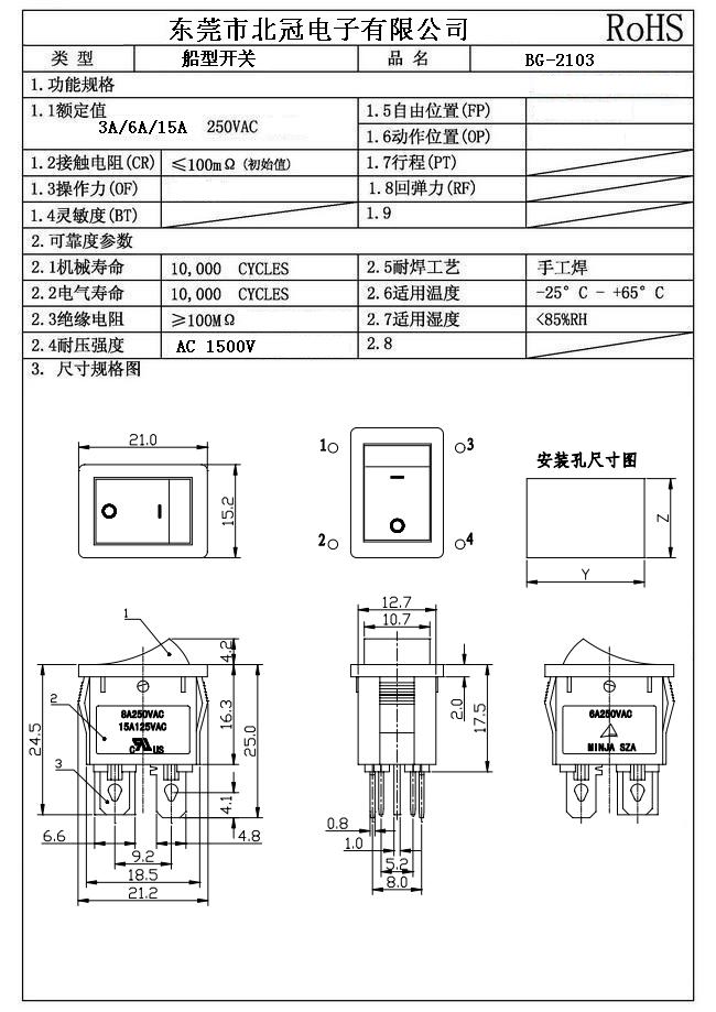 技術(shù)參數(shù)〔SPECIFICATION〕 額定電流、電壓: 6(4)A 250VAC 6A/125A 250VAC 6A 250VAC/10A 125VAC 接觸電阻:≤20mΩ 絕緣電阻:≥100MΩ 介電強(qiáng)度:≥1800VAC/3S 電器壽命:≥10000次