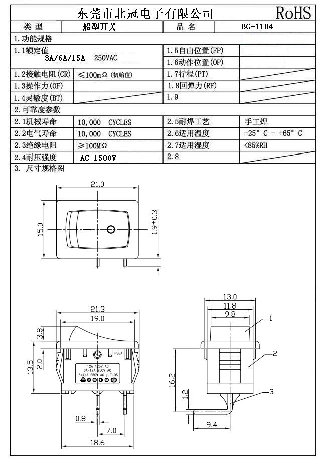 技術參數〔SPECIFICATION〕 額定電流、電壓: 6(4)A 250VAC 6A/125A 250VAC 6A 250VAC/10A 125VAC 接觸電阻:≤20mΩ 絕緣電阻:≥100MΩ 介電強度:≥1800VAC/3S 電器壽命:≥10000次