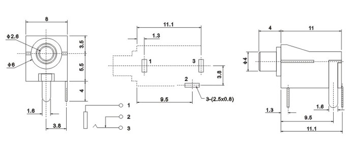 品名:2.5耳機插座 耳機插座技術參數: 1.額定負荷:0.5A 30V DC 2.按觸電阻:100 mΩ max. 3.使用溫度:-20℃~70℃ 4.插拔力:3-20N 5.使用壽命:5,000cycles 耳機插座主要組成部件: 1.塑膠底座 2.磷銅或鈹銅簧片