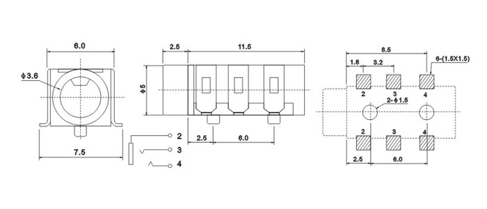 品名:3.5耳機插座 耳機插座技術參數: 1.額定負荷:0.5A 30V DC 2.按觸電阻:100 mΩ max. 3.使用溫度:-20℃~70℃ 4.插拔力:3-20N 5.使用壽命:5,000cycles 耳機插座主要組成部件: 1.塑膠底座 2.磷銅或鈹銅簧片